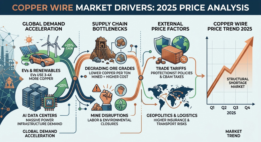 The increase in copper wire prices is driven by several long-term structural factors, including limited mining supply, growing demand from new technologies, and geopolitical changes affecting global trade.