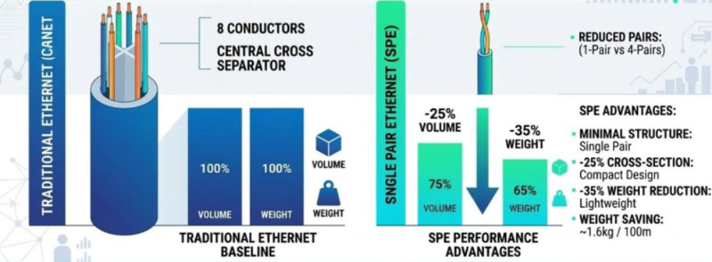 The emergence of Single Pair Ethernet (SPE) has completely broken this deadlock. It simplifies the traditional 4-pair (8-core) Ethernet cable down to just 1 pair (2 cores), yet still achieves high-speed data transmission and synchronized power supply. This is not just a physical "slimming down," but a fundamental revolution that enables seamless, all-IP communication from the sensor directly to the cloud.