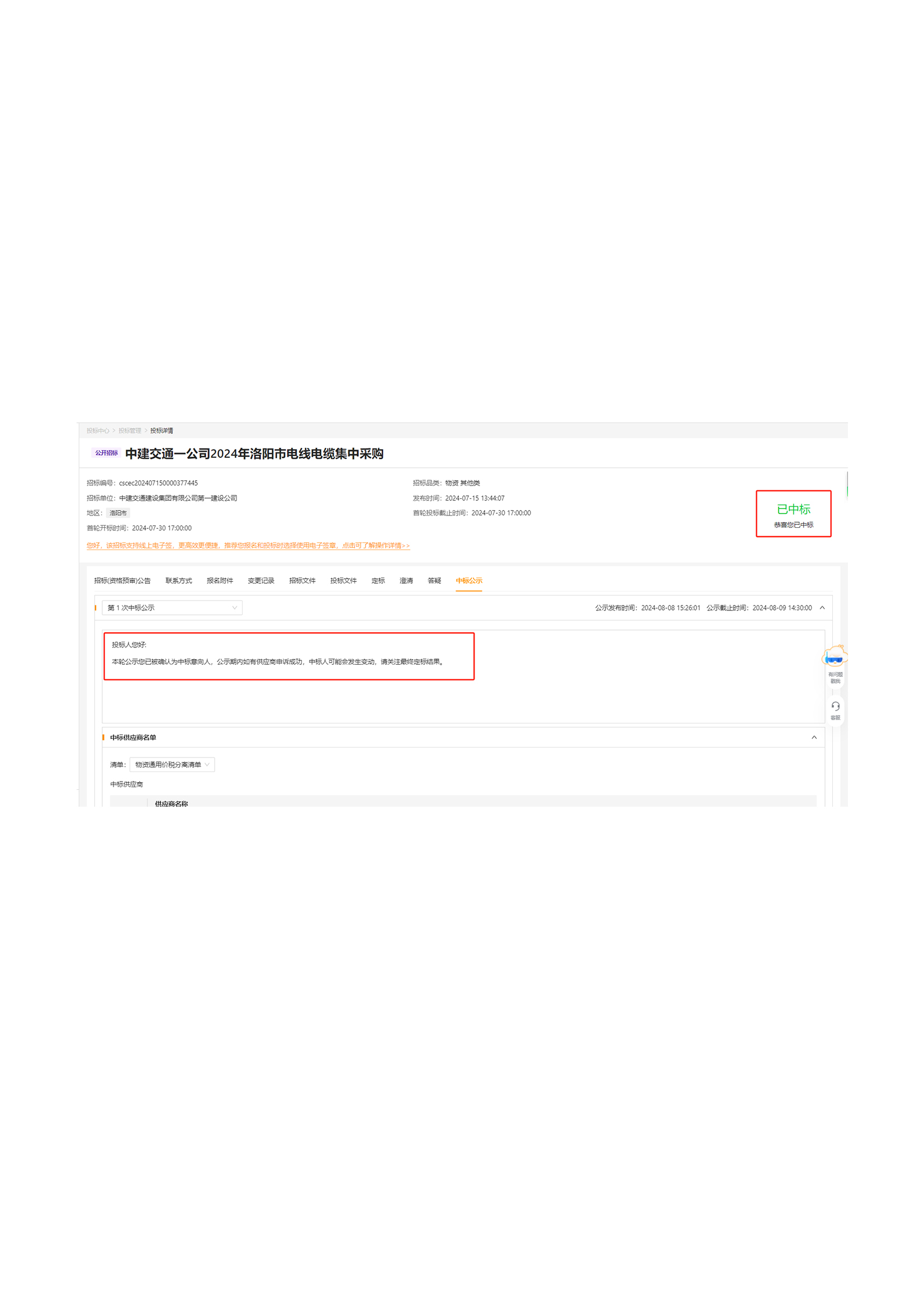 (Bid winning announcement) China Construction Communications No.1 Company's centralized procurement of wires and cables in Luoyang City in 2024