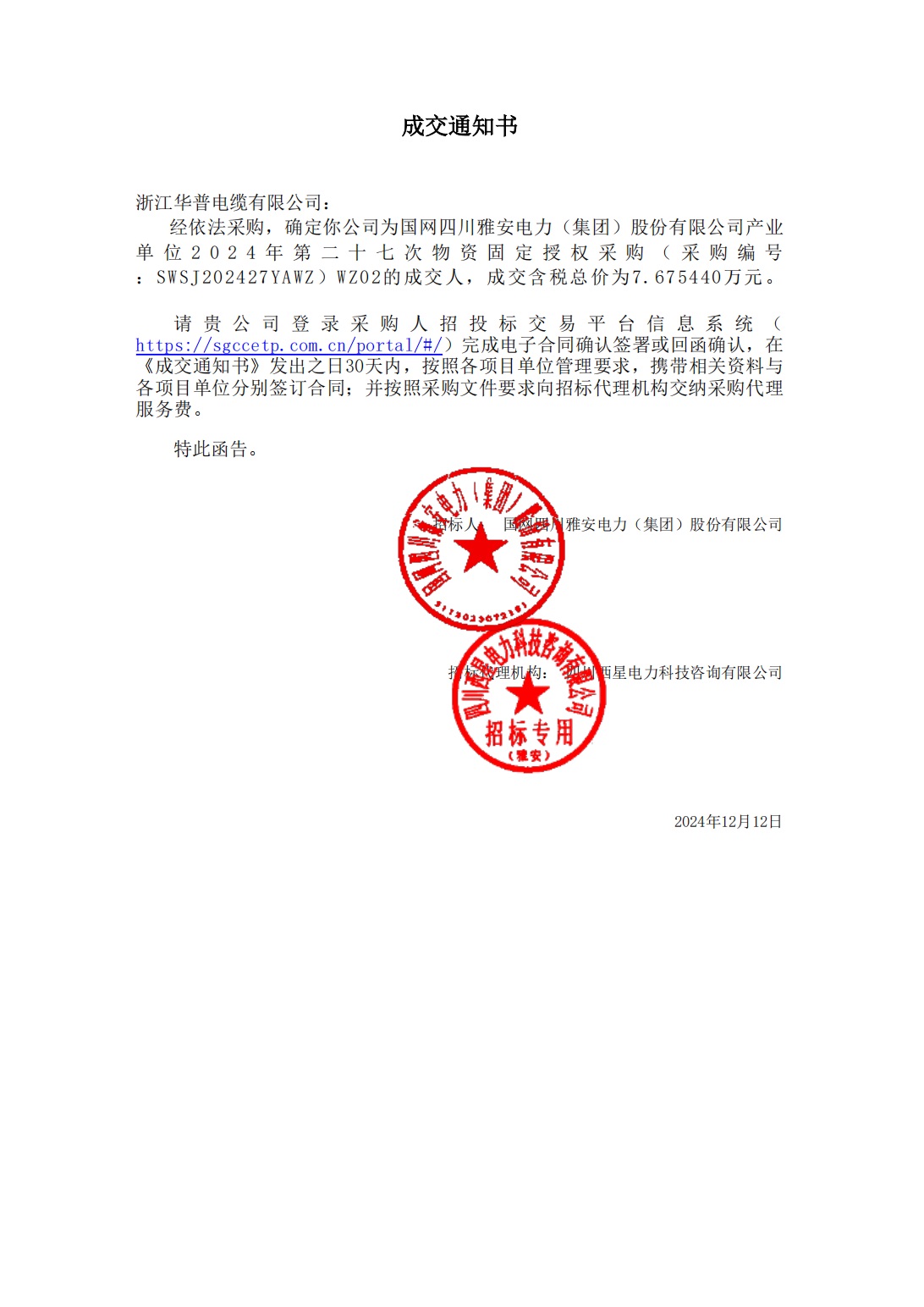 (Notification of Award) State Grid Sichuan Ya'an Electric Power (Group) Co., Ltd. Industrial Unit's 27th Fixed Authorized Procurement of Materials in 2024