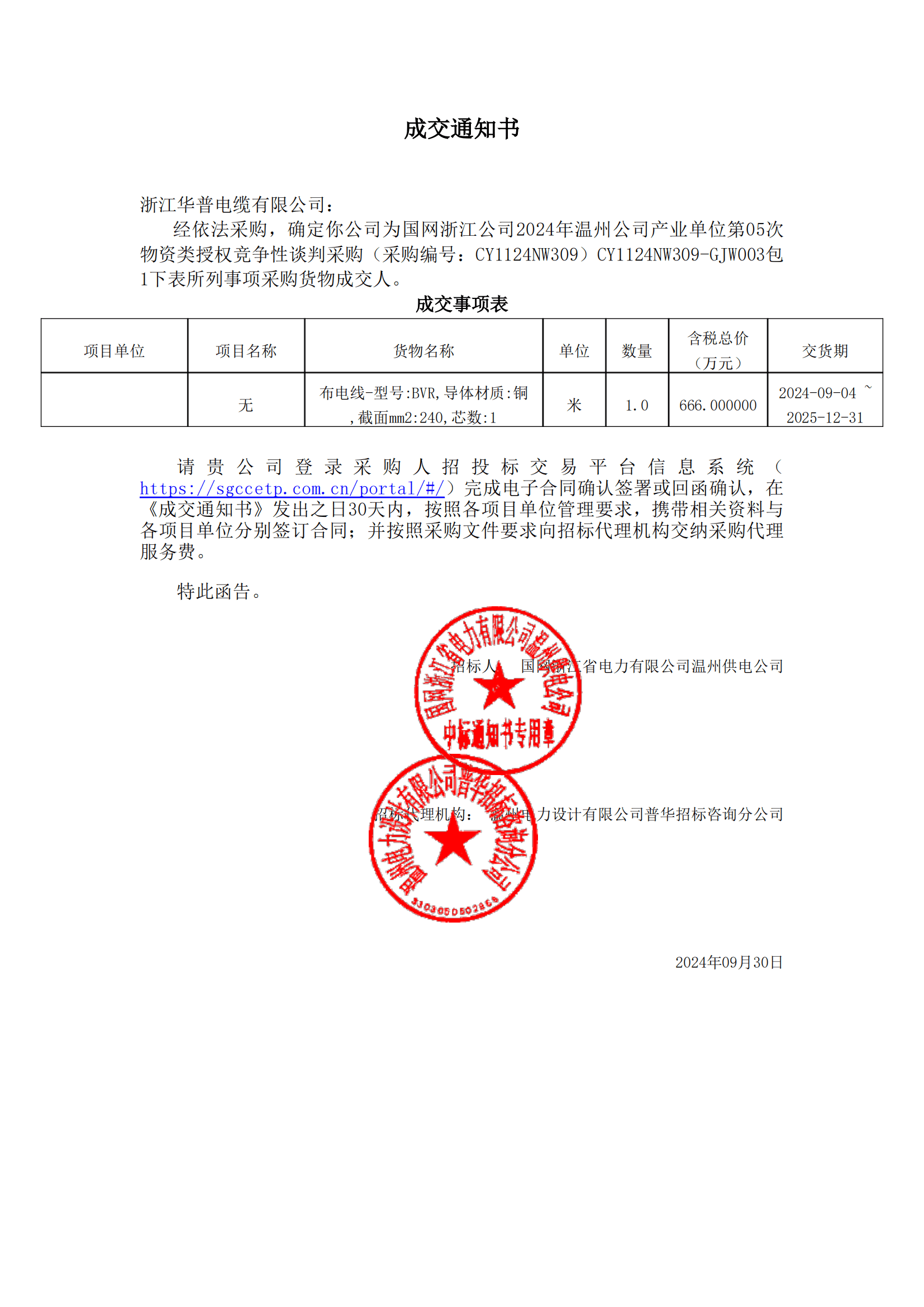 (Bid Winning Notice) State Grid Zhejiang Company's 5th Competitive Negotiation Procurement of Materials Authorization for Industrial Units of Wenzhou Company in 2024