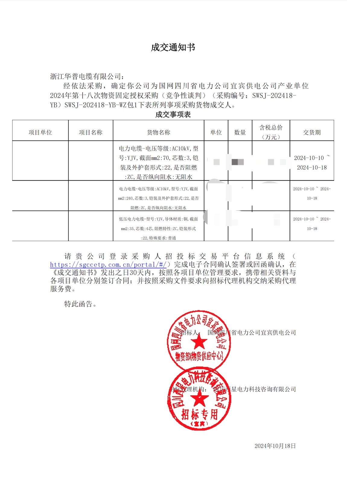 (Notification of Award) State Grid Sichuan Electric Power Company Yibin Power Supply Company Industrial Unit's 18th Fixed Authorized Procurement of Materials in 2024 (Competitive Negotiation)