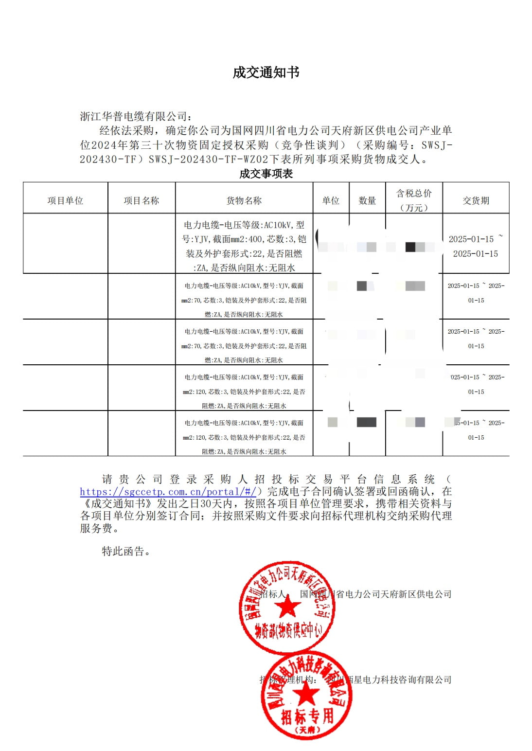 (Bid Winning Notice) State Grid Sichuan Electric Power Company Tianfu New Area Power Supply Company Industrial Unit's 30th Fixed Authorized Procurement of Materials in 2024 (Competitive Negotiation)