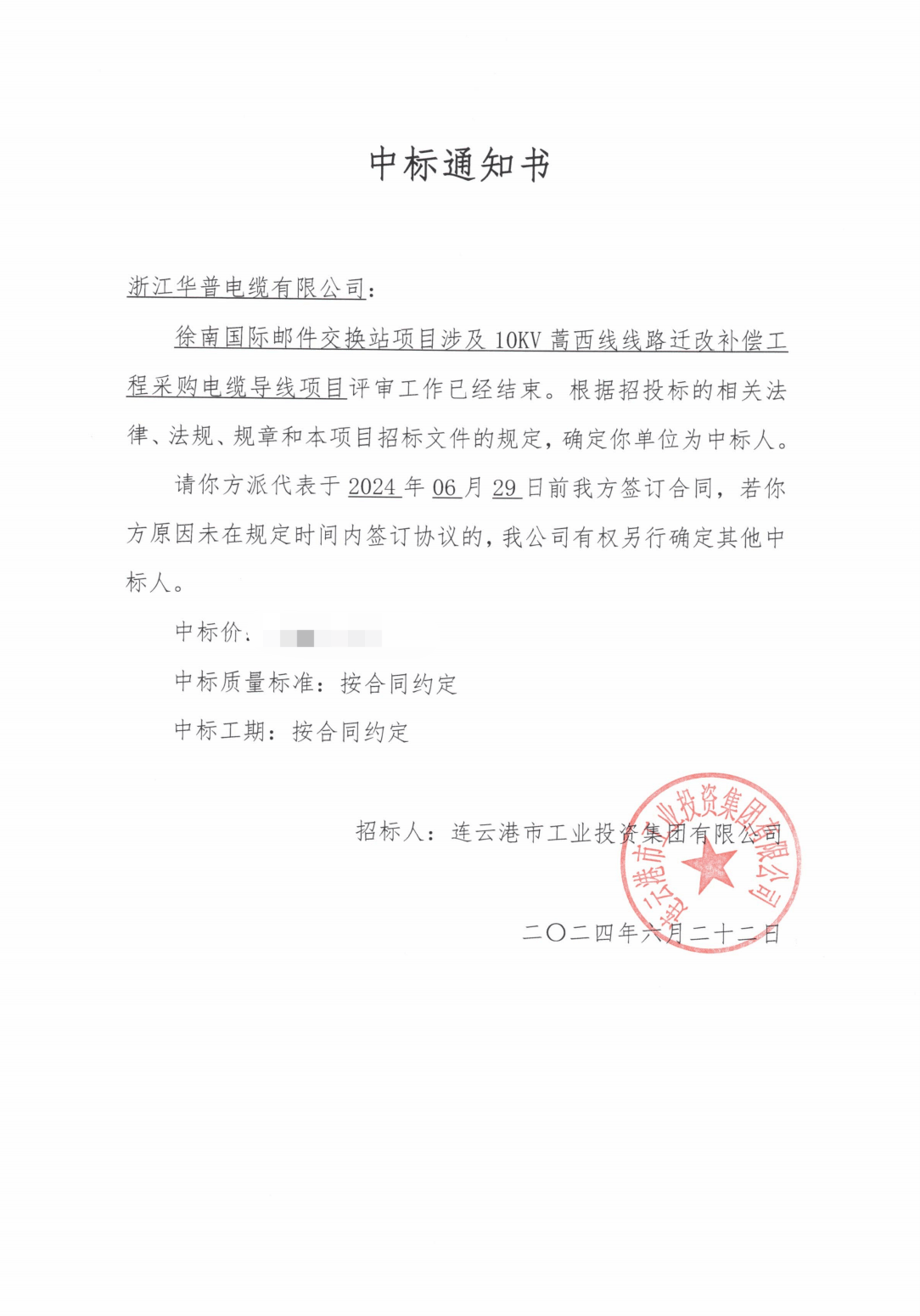(Bid winning notice) The Xunan International Mail Exchange Station project involves the procurement of cable and wire for the 10KV Haoxi Line relocation and compensation project