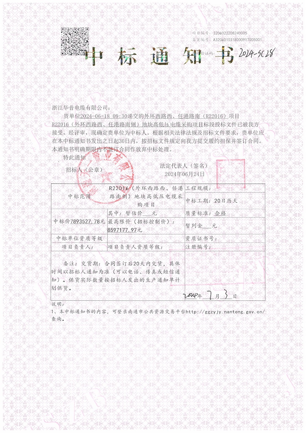 (Bid Winning Notice) Nantong R22016 (West Outer Ring Road, South Rengang Road) High and Low Voltage Cable Procurement Project
