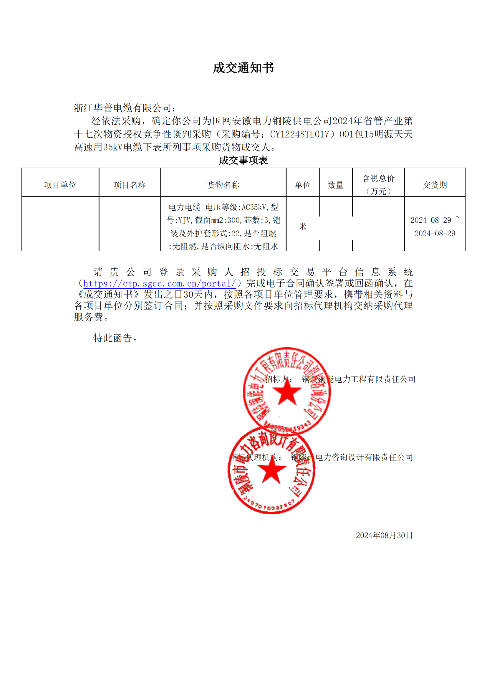 (Bid Winning Notice) State Grid Anhui Electric Power Tongling Power Supply Company's 17th Provincial Administration Industry Material Authorization Competitive Negotiation Procurement in 2024