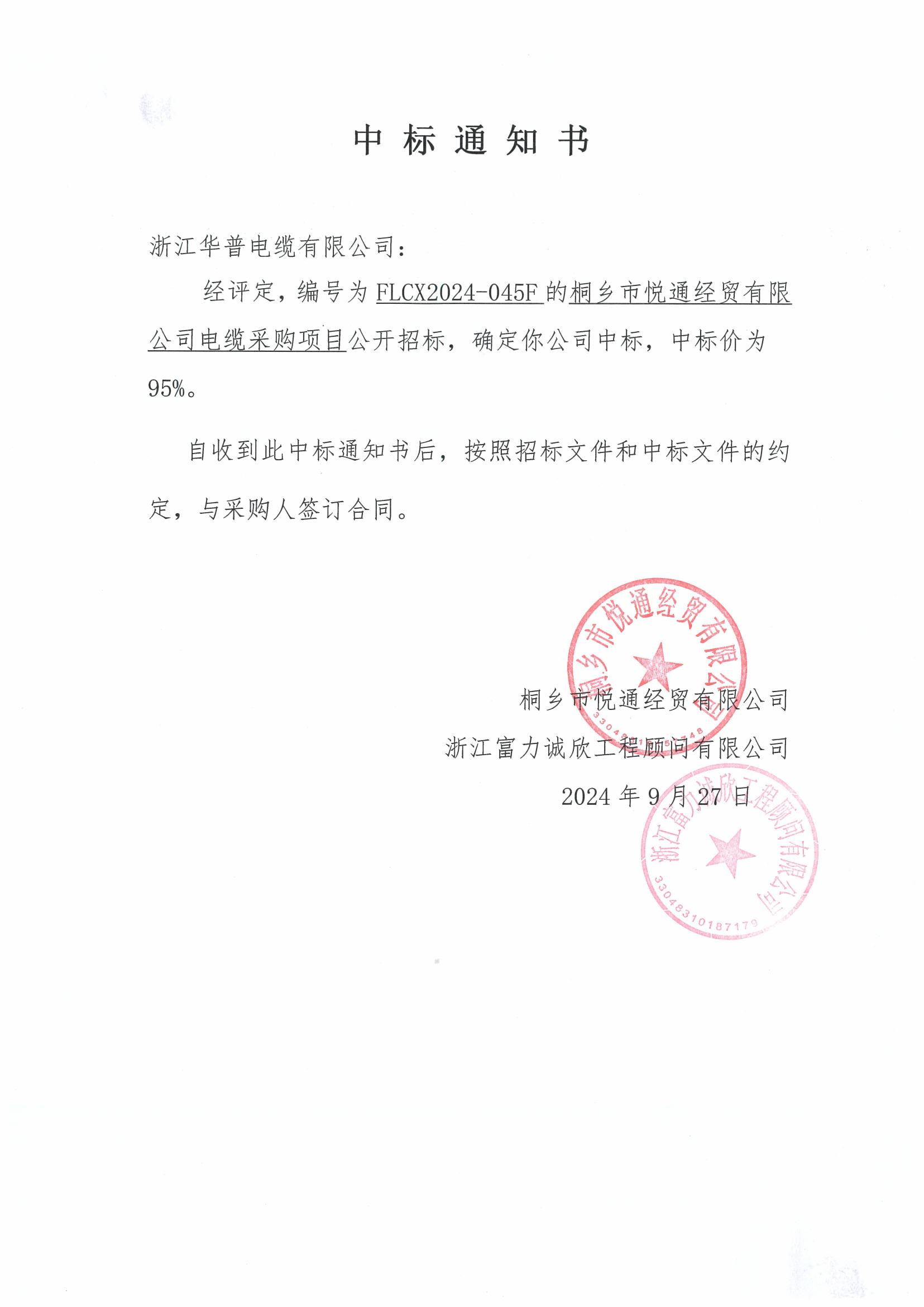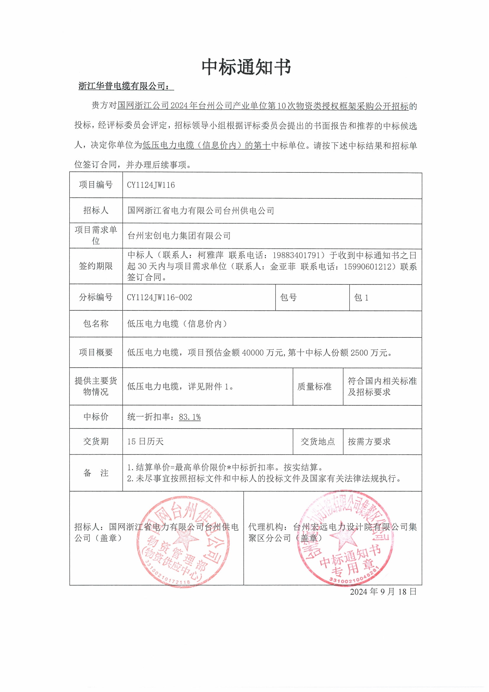 (Notification of Award) State Grid Zhejiang Company's 10th Public Bidding for Material Authorization Framework Procurement of Taizhou Company's Industrial Units in 2024