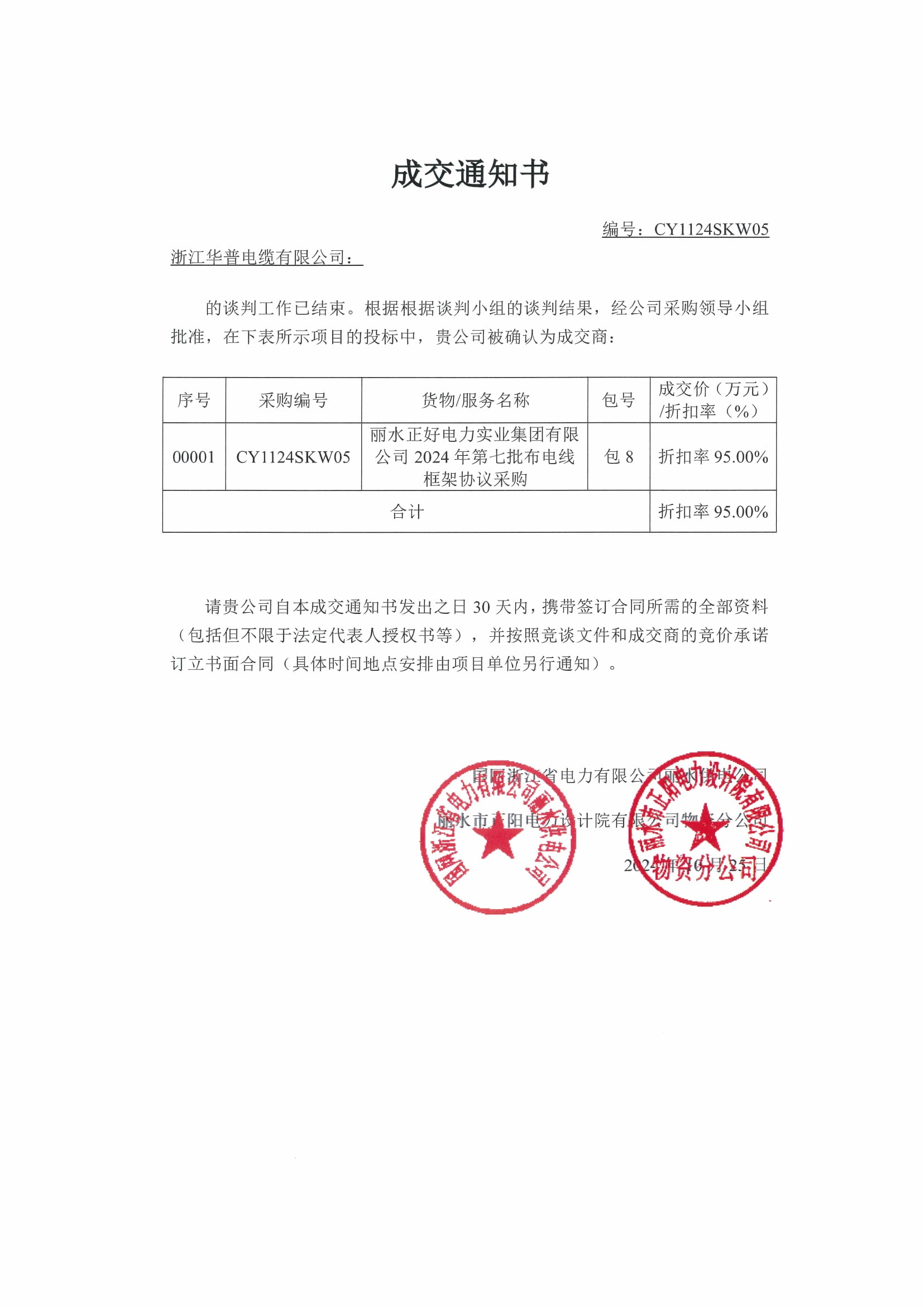(Bid Winning Notice) State Grid Zhejiang Electric Power Lishui Power Supply Company's competitive negotiation and procurement of the fifth provincial managed industry material authorization framework in 2024
