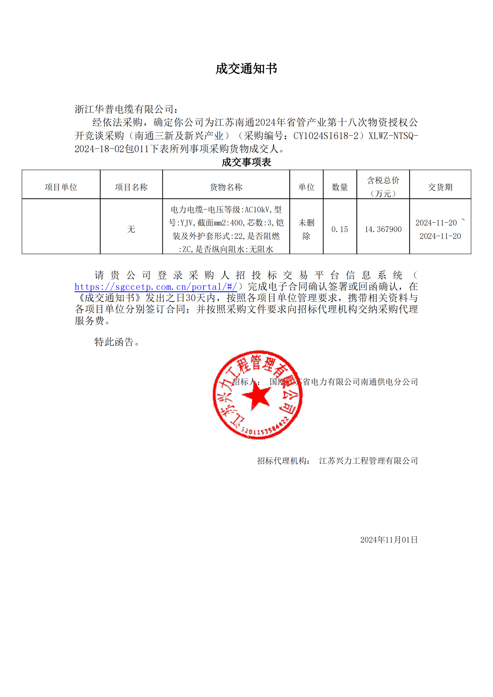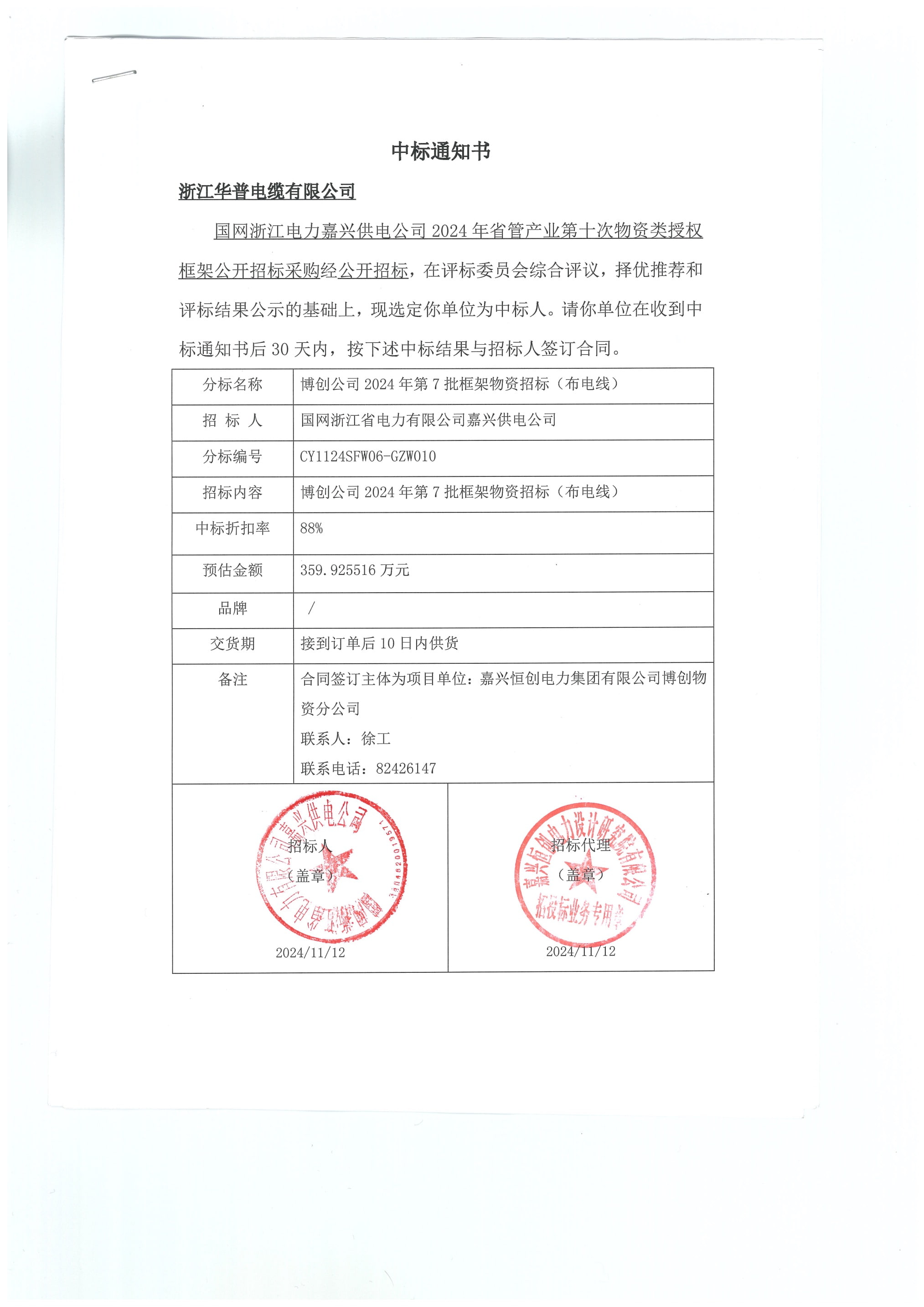 (Notification of Award) State Grid Zhejiang Electric Power Jiaxing Power Supply Company's 10th Provincial Administration Industry Material Authorization Framework Public Bidding and Procurement in 2024