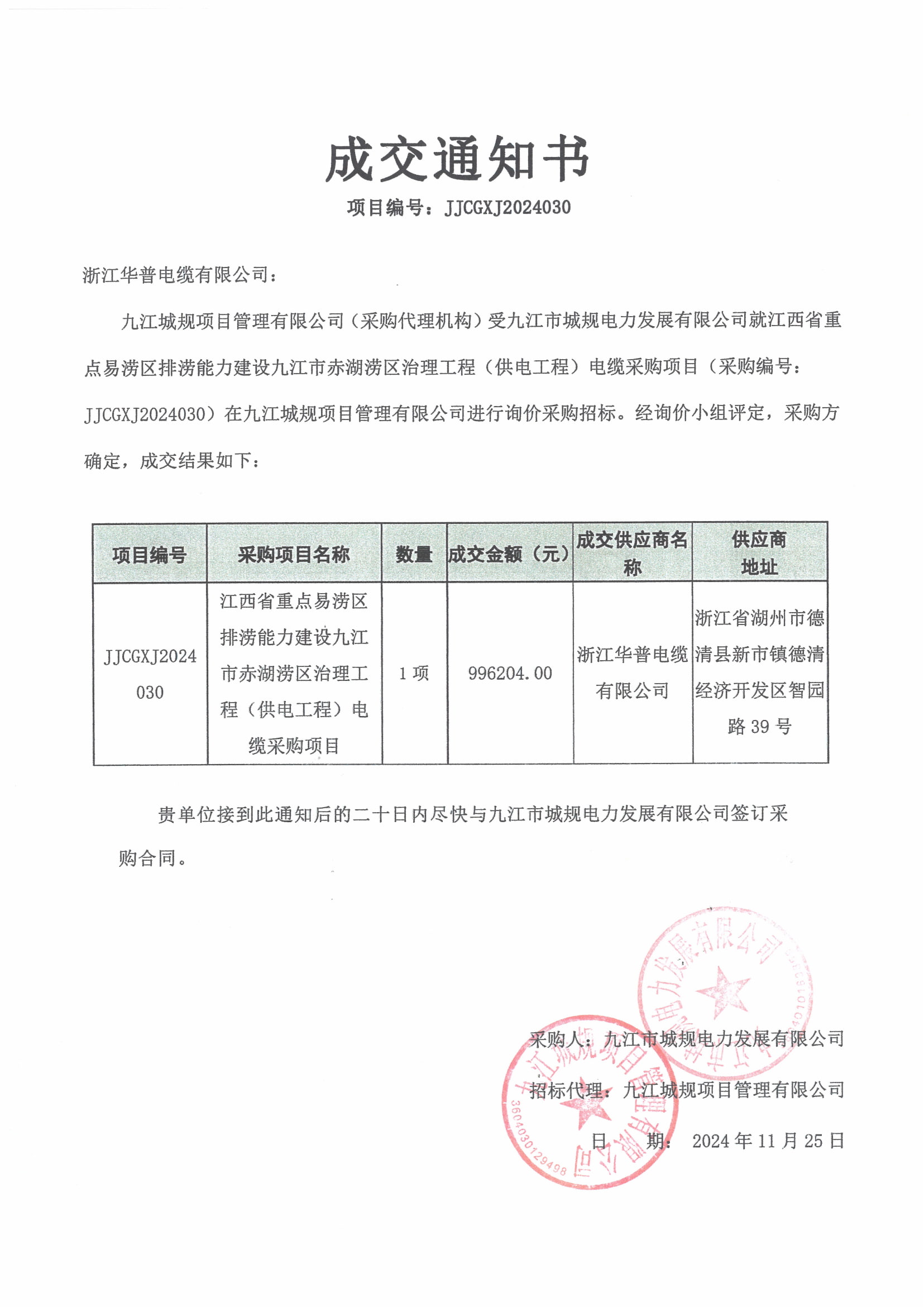 (Notification of Award) Construction of Drainage Capacity in Key Flood prone Areas in Jiangxi Province, Jiujiang City, Chihu Flood Control Project (Power Supply Project), Cable Procurement