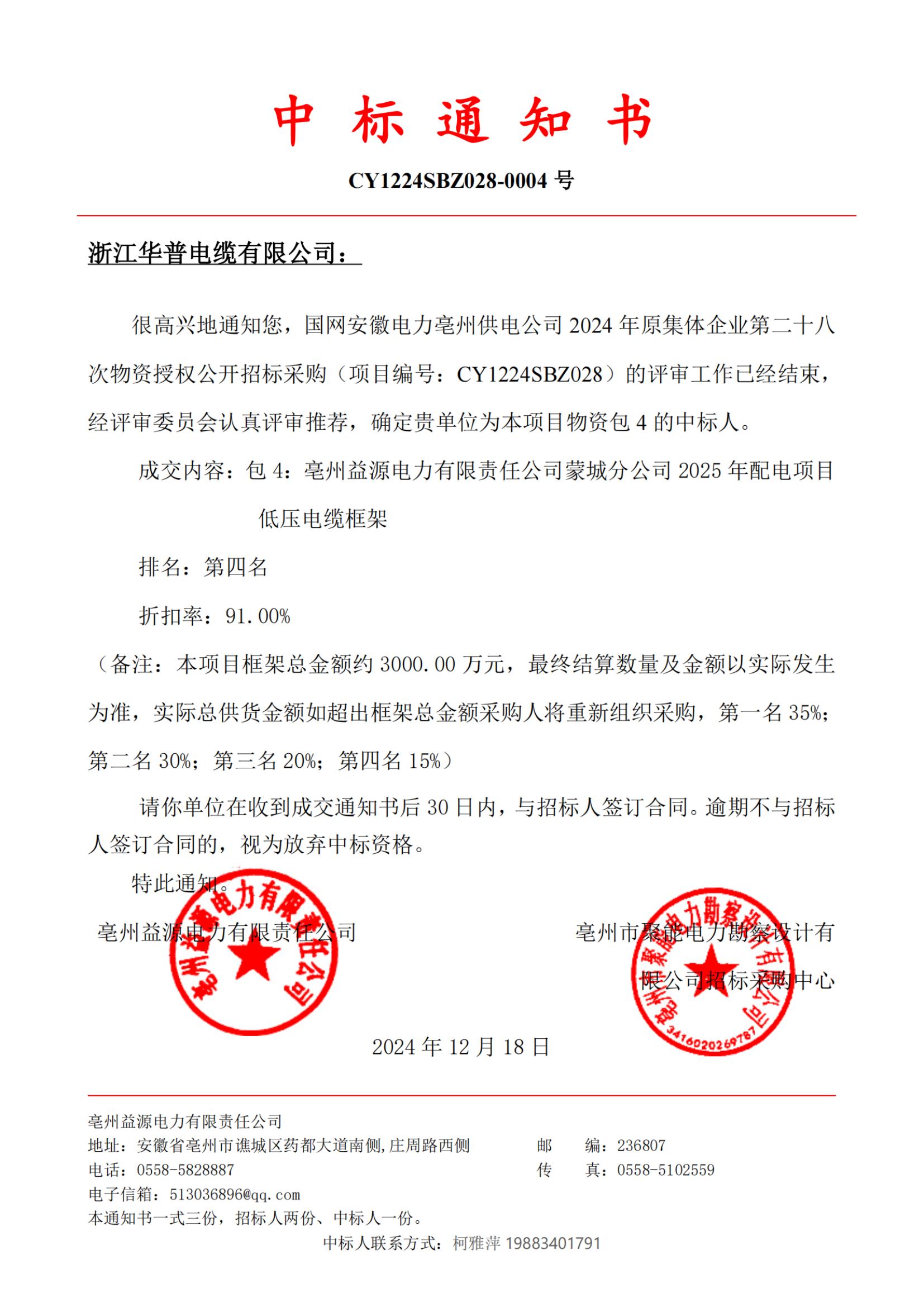 (Notification of Award) State Grid Anhui Electric Power Bozhou Power Supply Company's 28th Public Bidding and Procurement of Materials Authorization for Original Collective Enterprises in 2024