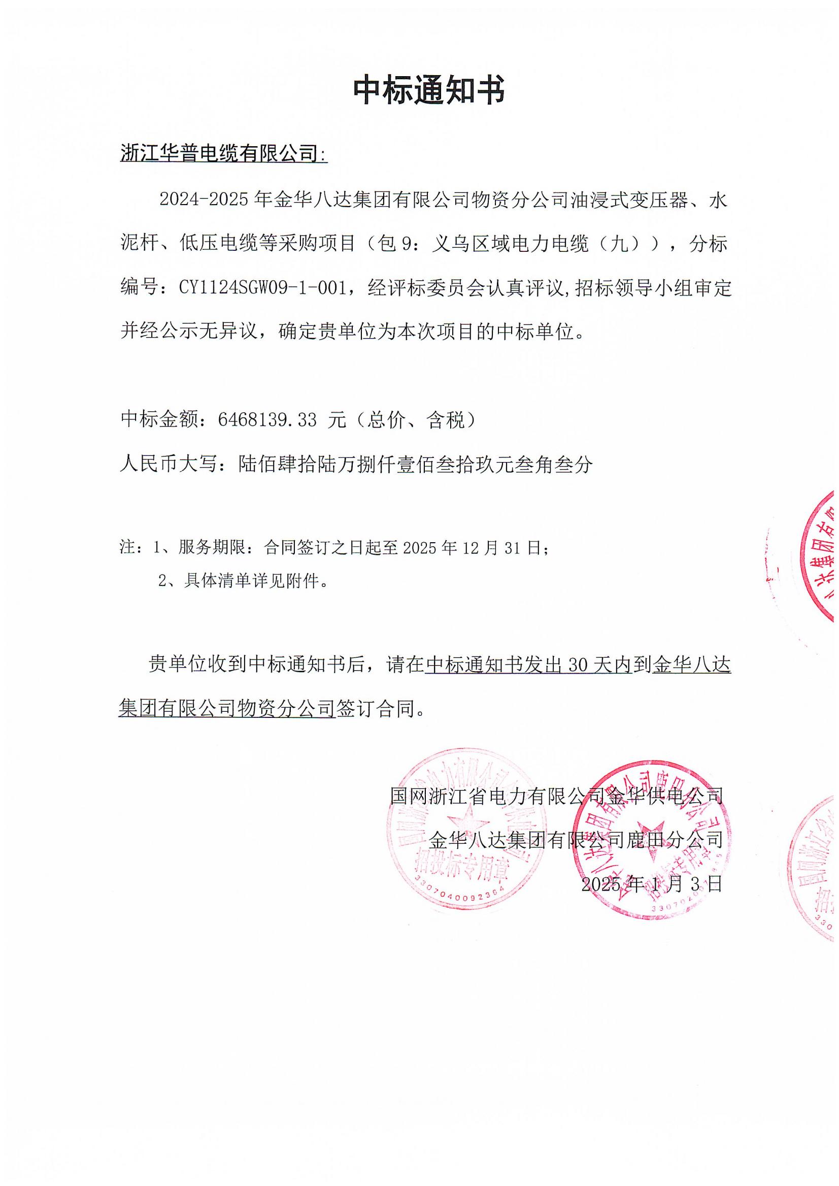 (Notification of Award) State Grid Zhejiang Jinhua Power Supply Company's 13th Provincial Administration Industry Material Authorization Framework Public Bidding and Procurement in 2024